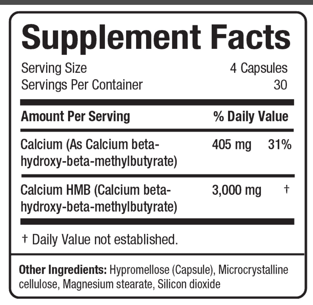 Amount Per Serving % Daily Value Calcium (As Calcium beta-hydroxy-beta-methylbutyrate) 405 mg 31% Calcium HMB (Calcium beta-hydroxy-beta-methylbutyrate) 3,000 mg †