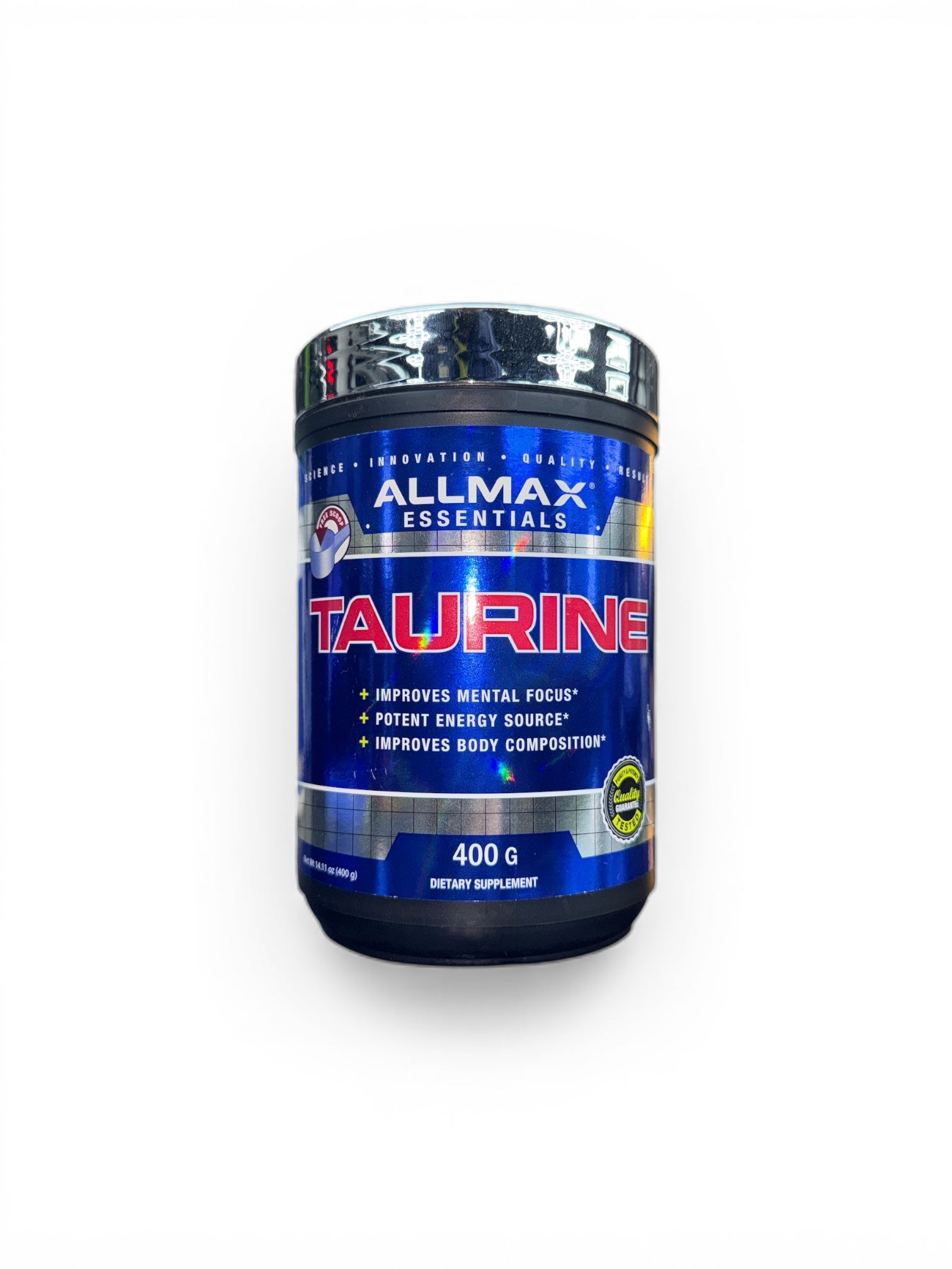 ALLMAX Essentials Taurine comes in a 400 g Container as a free flowing powder allowing you to add to anything you like. ALLMAX Essentials Taurine is a pure, flavorless, unsweetened white crystalline powder that mixes easily.